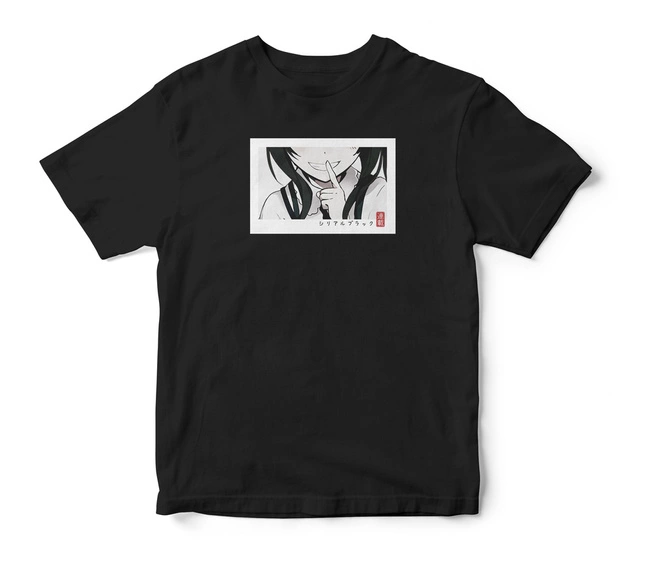 Stylowy t-shirt dla fanów anime, przedstawiający tajemniczy uśmiech dziewczyny. Czarno-biała grafika w stylu mangowym spodoba się każdemu otaku!