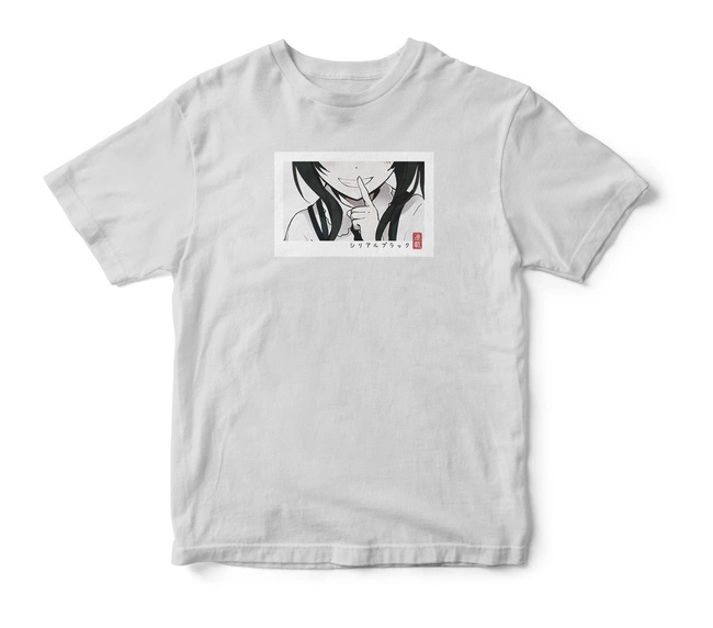Stylowy t-shirt dla fanów anime, przedstawiający tajemniczy uśmiech dziewczyny. Czarno-biała grafika w stylu mangowym spodoba się każdemu otaku!