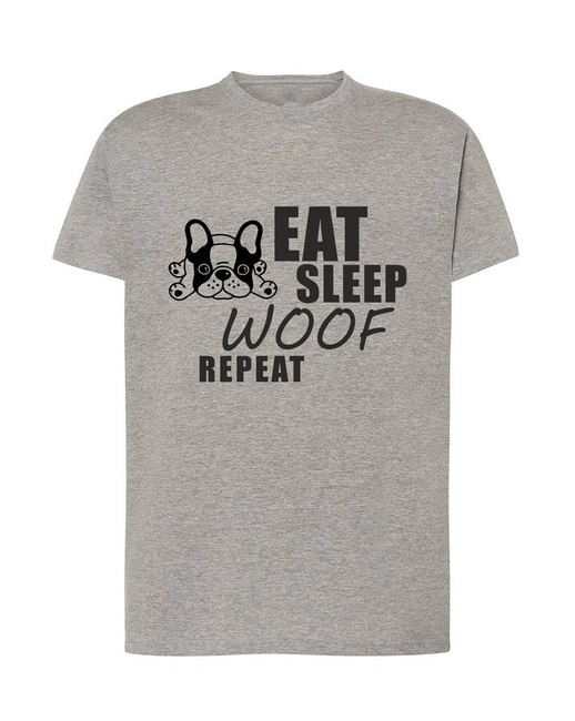 - Koszulka inspirowana znanym hasłem EAT SLEEP REPEAT. Najchętniej nie robiłbyś nic oprócz jedzenia i spania? Do tego lubisz pieski? To świetnie się składa! Wyraź siebie naszą bawełnianą koszulką z nadrukiem wysokiej jakości.